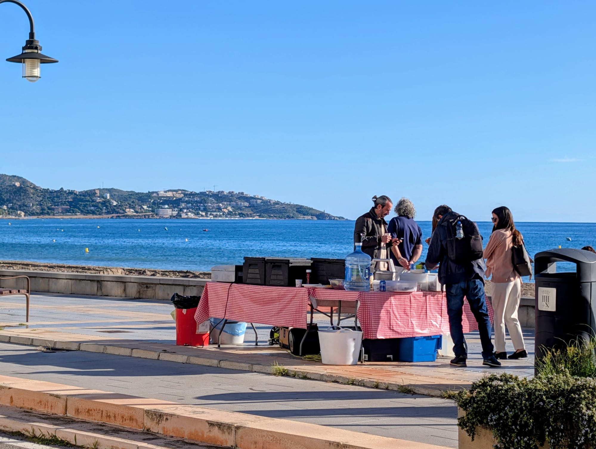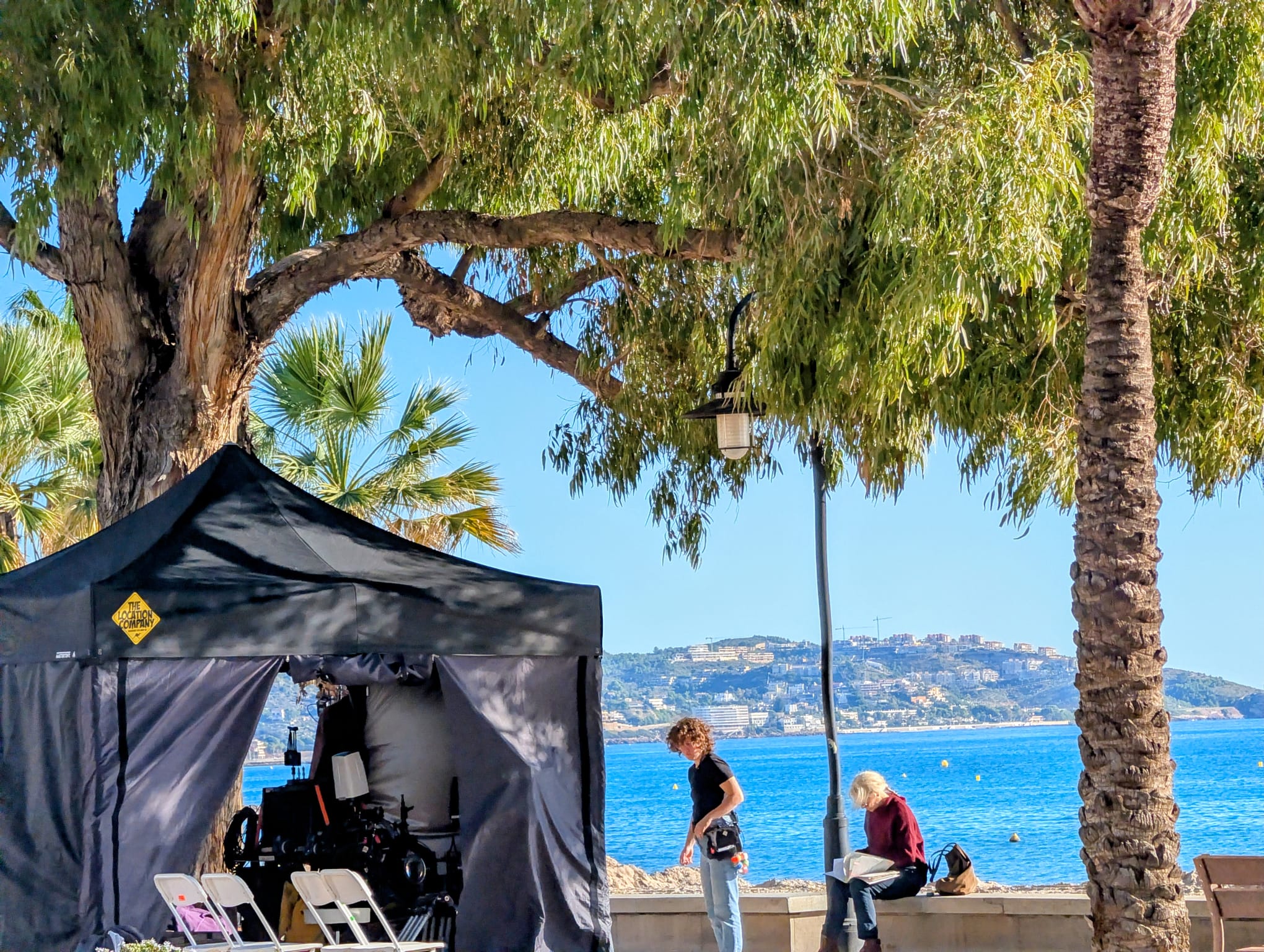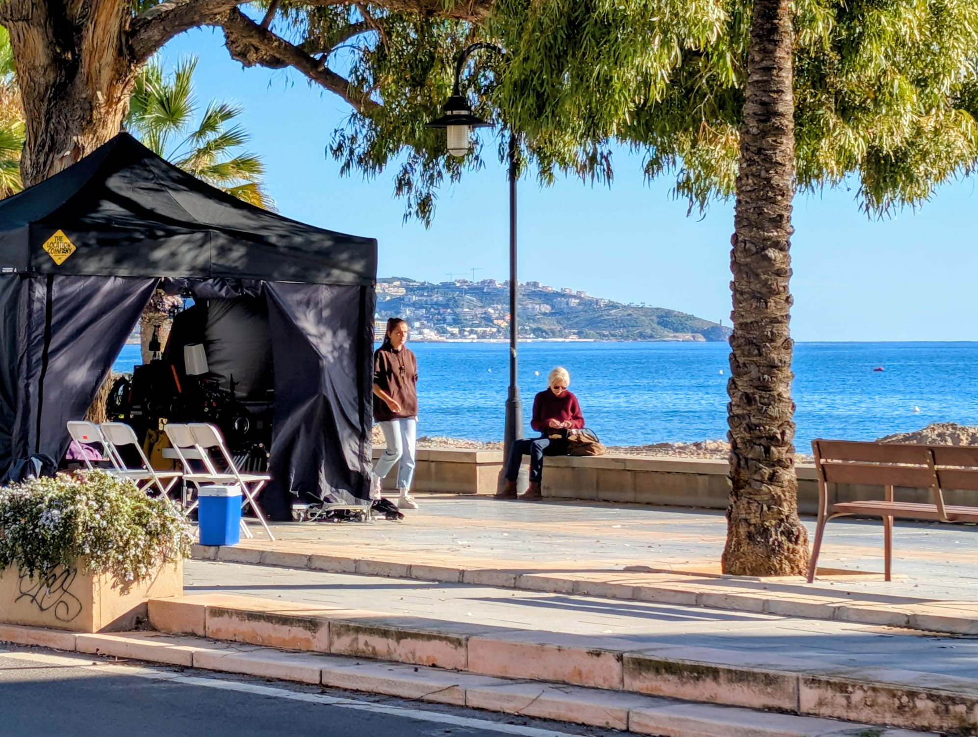 Durante la mañana también se graban escenas en una cafetería próxima a la playa Heliópolis. En torno a las 10.00 h, la producción ha hecho una pausa para el almuerzo con un catering preparado junto al set. Belén Rueda, con una larga trenza rubia y gafas de sol, ha repasado el guion antes de unirse al resto del equipo técnico y artístico.