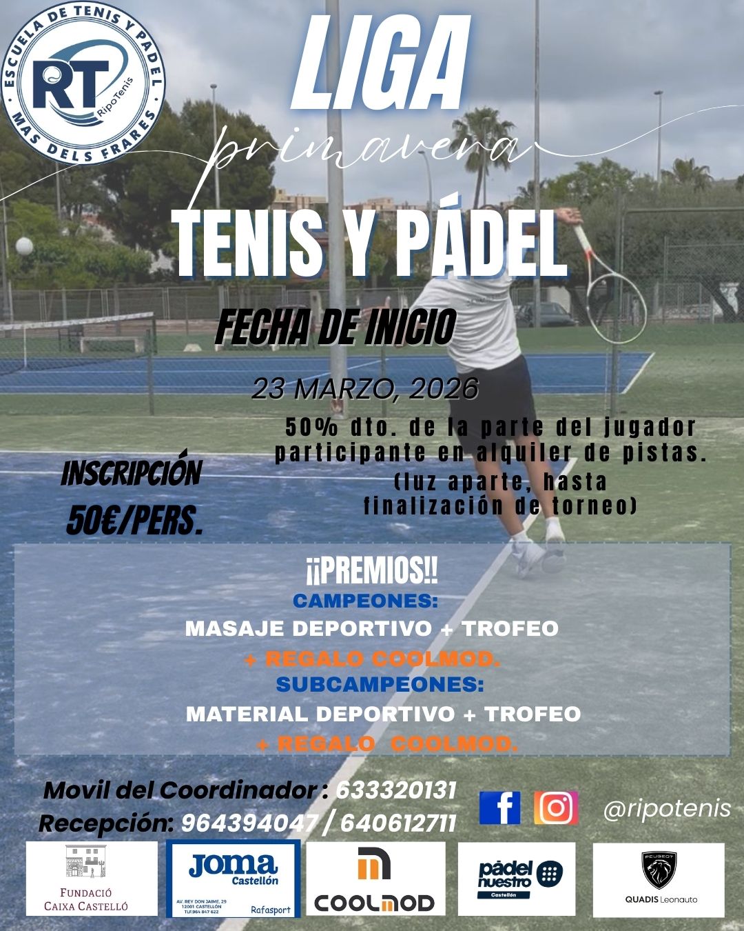 La Escuela de Tenis y Pádel Ripotenis pone en marcha su Liga de Primavera, una nueva competición que comenzará el 23 de marzo y que invita a jugadores locales a competir tanto en tenis como en pádel con ventajas económicas y premios atractivos.