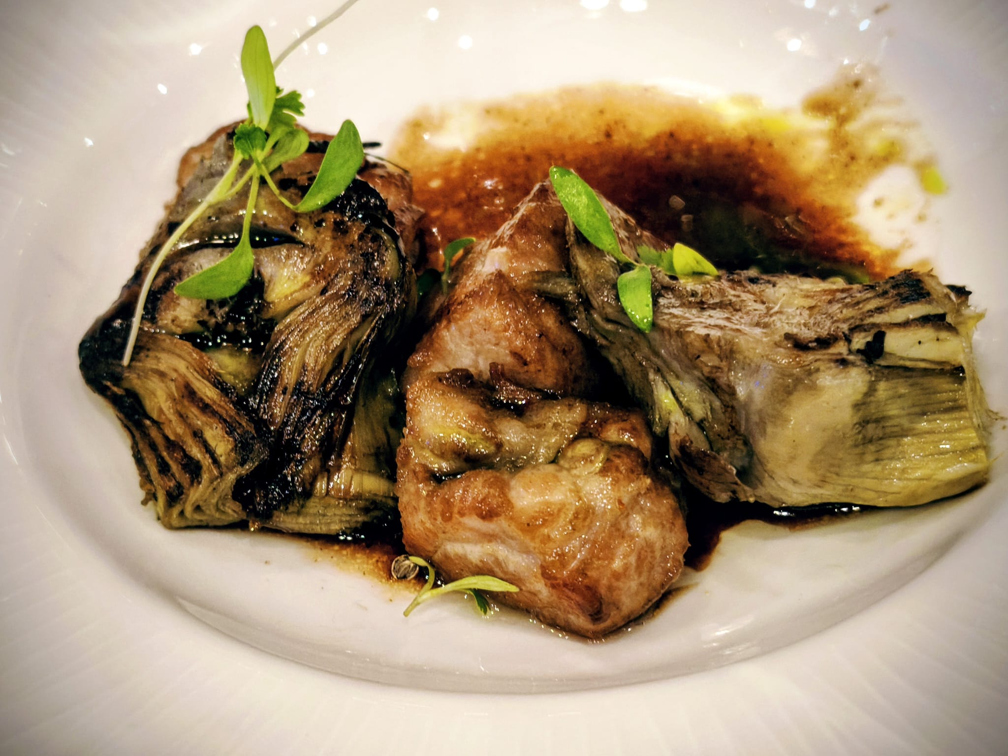 Las alcachofas con mollejas, enriquecidas con una intensa demi-glace, confirmaron el peso de los fondos en la cocina de Boga. Aquí no hay atajos: hay tiempo, reducción y sabor concentrado.
