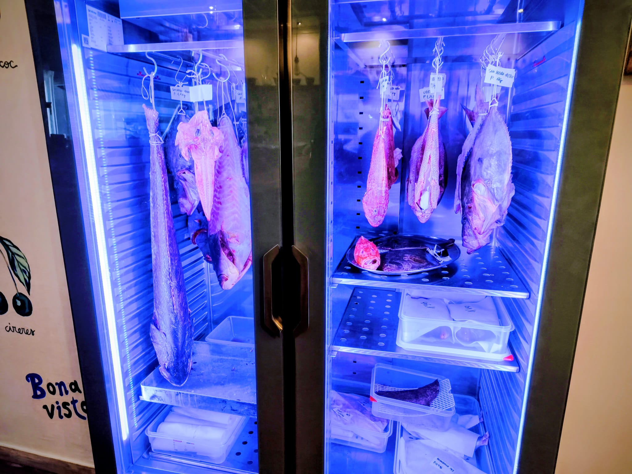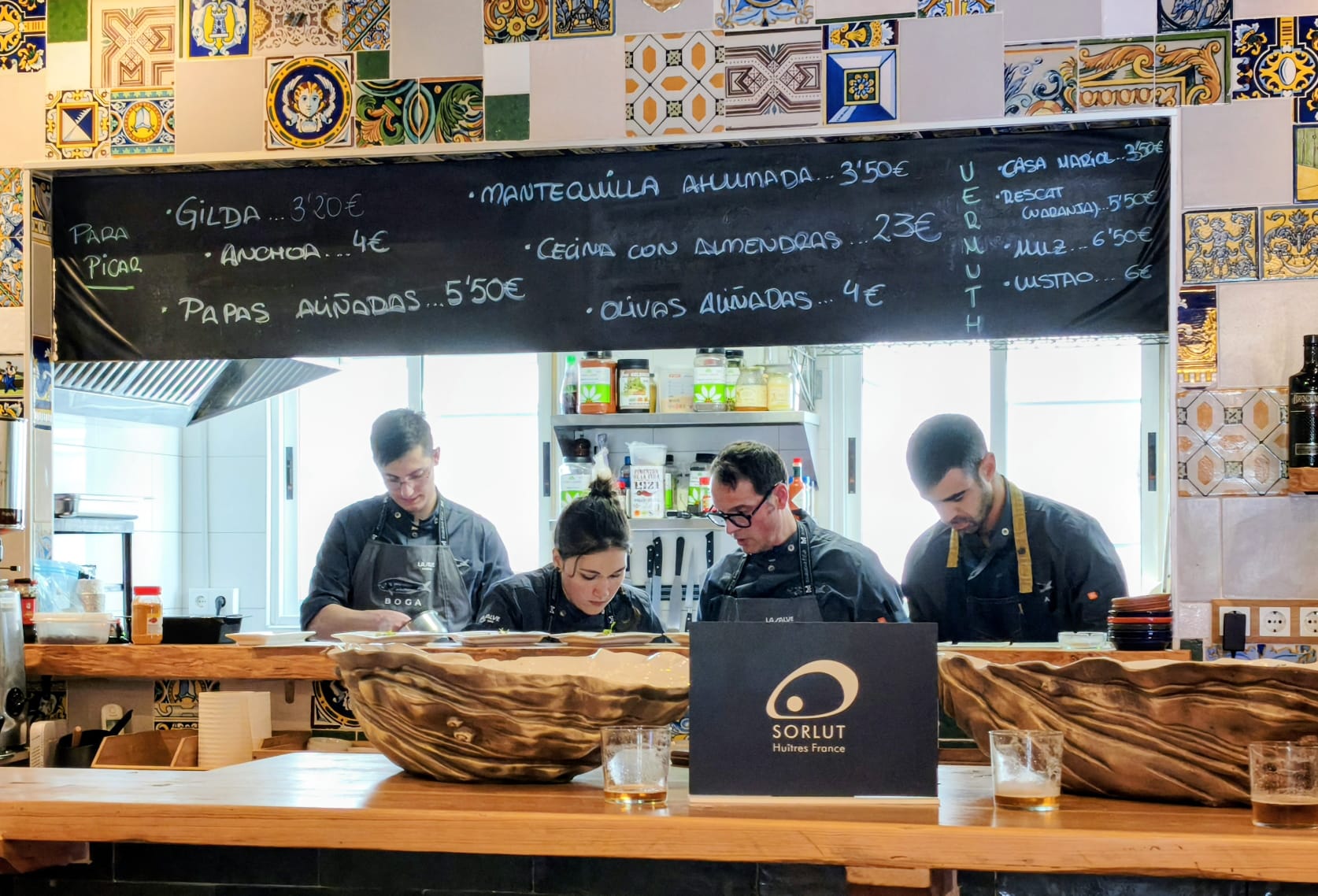 El restaurante muestra sin esconder su esencia: una cocina semiabierta que permite intuir el ritmo del servicio y el protagonismo del fuego, una nevera expositora con pescados enteros donde el comensal puede elegir la pieza que después se preparará a la brasa, y una estantería donde reposan conservas elaboradas por el propio equipo, reflejo de una cocina que va más allá del pase y trabaja el producto en todas sus fases.