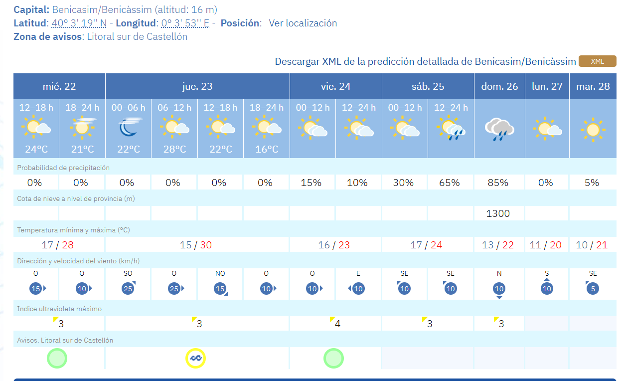 El mes de octubre avanza con un tiempo inusualmente cálido en Benicàssim este otoño, donde el termómetro alcanzará este jueves los 30 grados, según la previsión de la Agencia Estatal de Meteorología (Aemet). La situación ha llevado además a activar la alerta amarilla por fenómenos costeros en el litoral sur de Castellón, con especial atención al oleaje y los vientos del suroeste que podrían intensificarse durante la jornada.