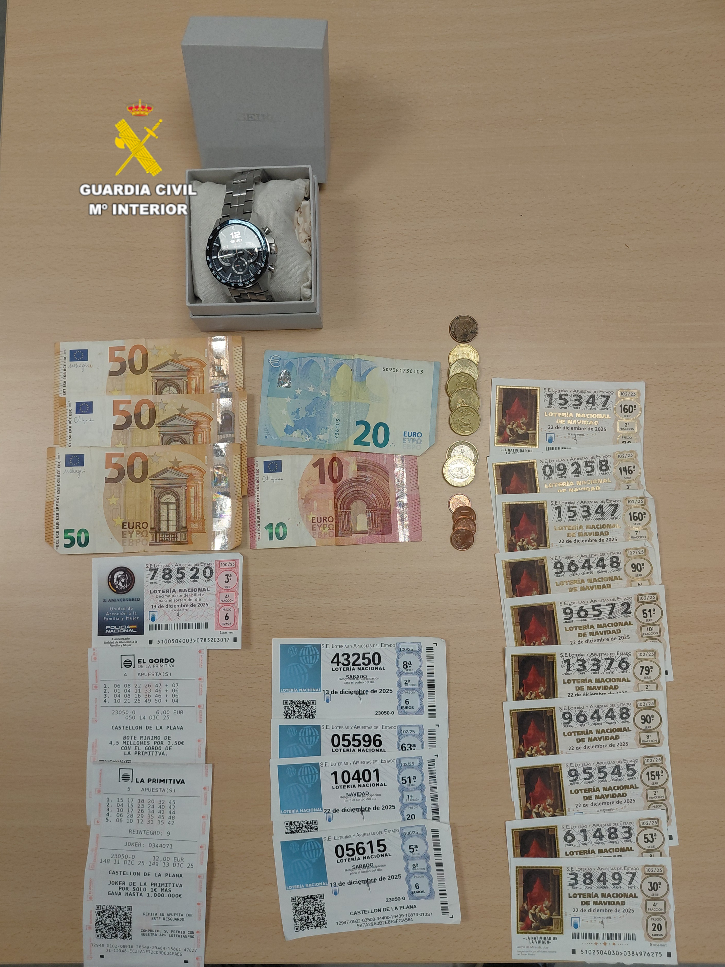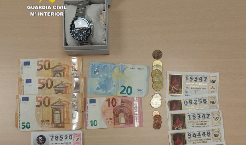 Entre los efectos intervenidos por los agentes se encuentran décimos de lotería, boletos de la Primitiva, un reloj y dinero en efectivo, presuntamente procedentes del robo.