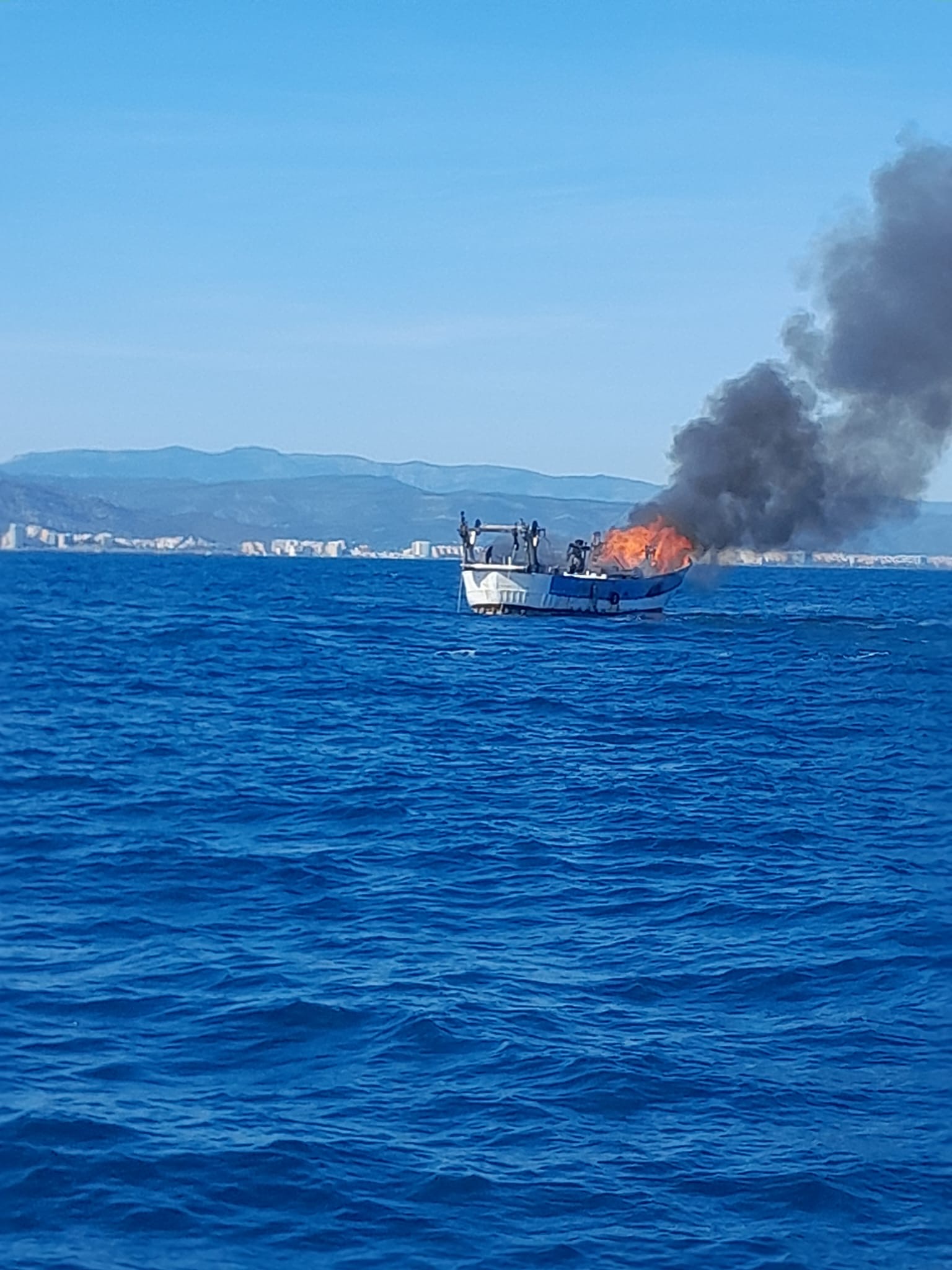 El suceso se produjo a unas 8 millas al este de Benicàssim, donde el fuego se declaró a bordo del barco y obligó a activar un amplio dispositivo de rescate en el mar.
